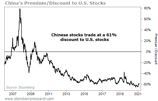 Since 2005, Chinese stocks have traded at an average discount of 30% to U.S. stocks based on this measure. Today, they are trading at a 61% discount. Take a look…